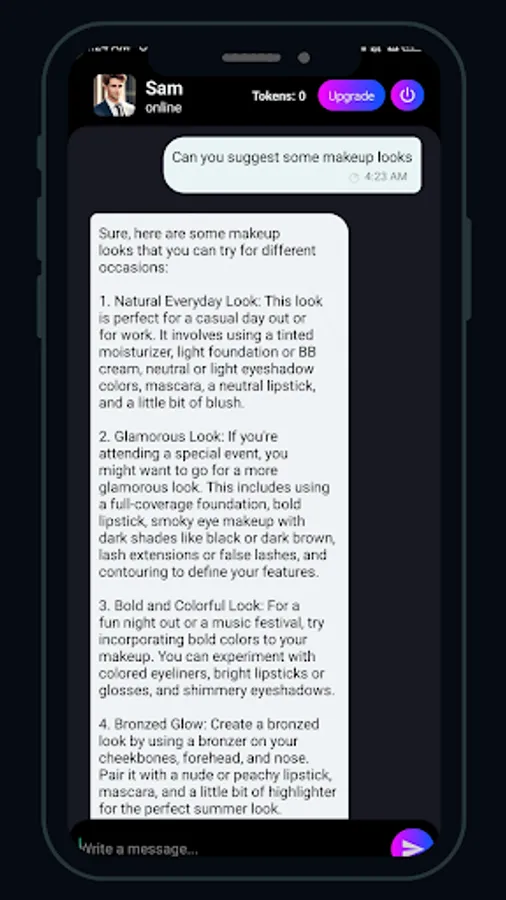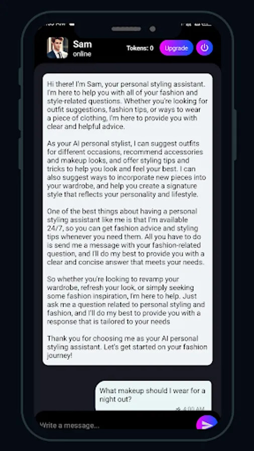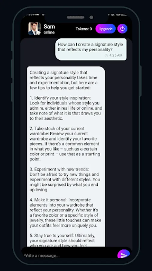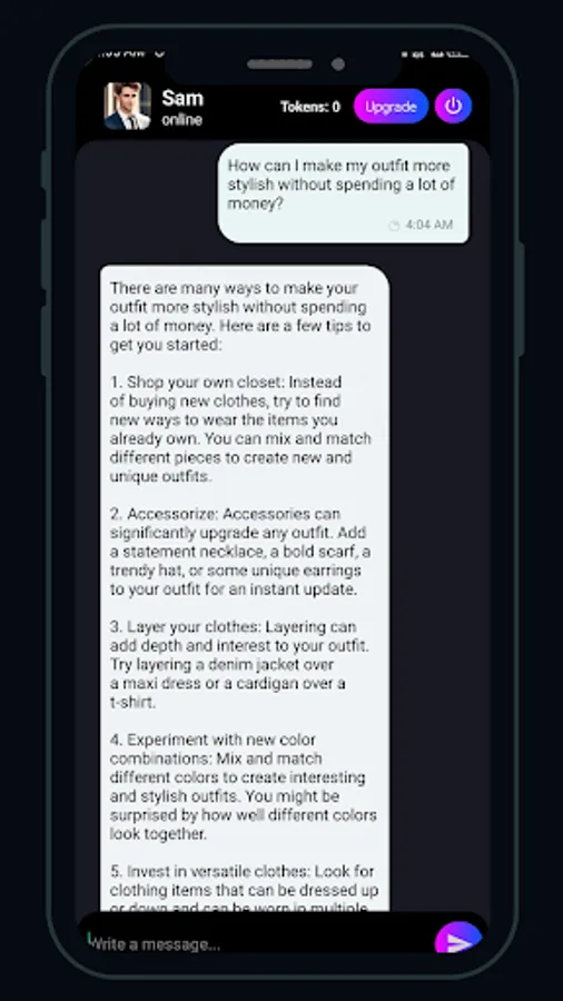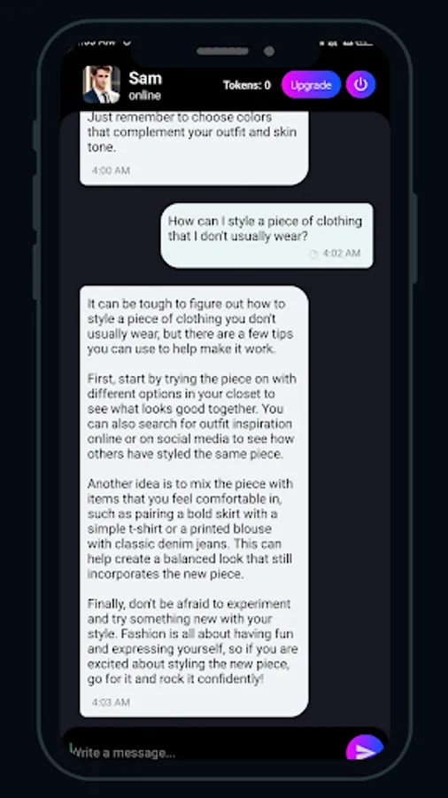 In addition to outfit suggestions, the app also provides valuable tips on color coordination, body shape flattery, fashion do's and don'ts, and much more. With Sam AI as your trusted style companion, you'll feel confident in your fashion choices and enhance your overall wardrobe.