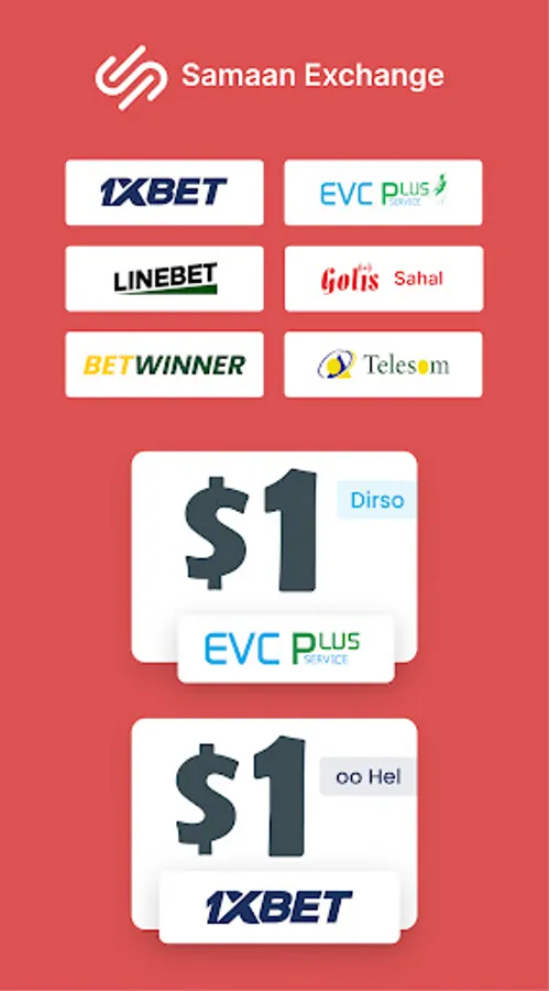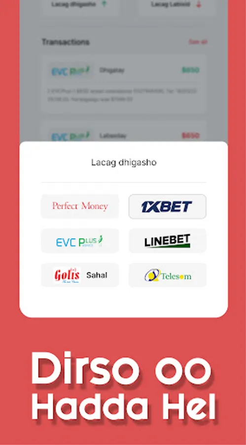 EvcPlus, Jeeb, E-Dahab, E-Sahal, Golis, 1Xbet, Linbet, Betwinner iyo Perfect Money