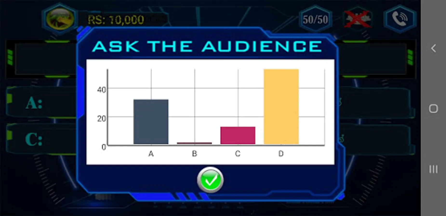 Each session of this general knowledge app is consisting with Ten(10) different Multiple Choice Questions. Just like the reality program, this game contains 3 different life line options to offer the real experience of a reality game show.