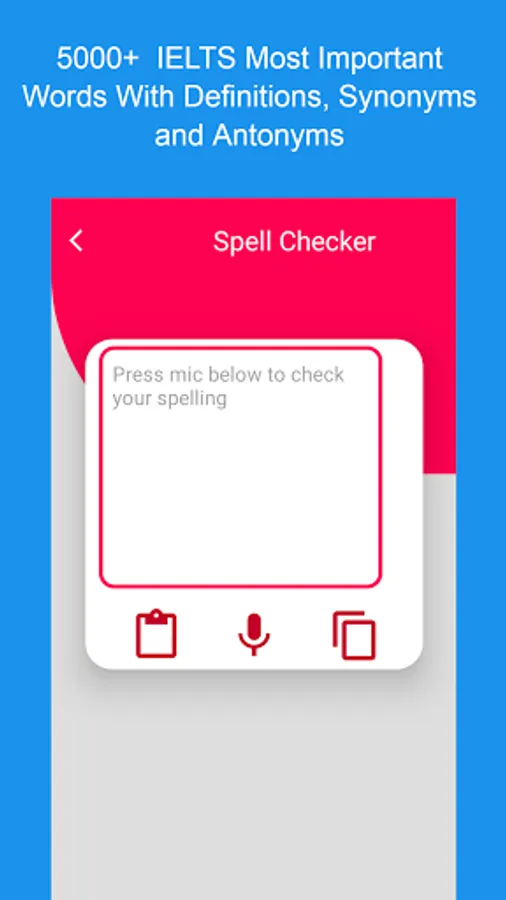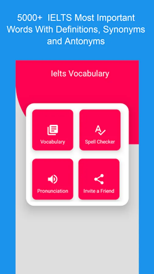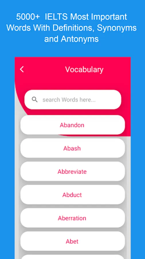 IELTS (International English Language Testing System) is an English language test which measures the English language ability for non-native speakers want to immigrate in English speaking countries or enroll in English-speaking universities. IELTS vocabulary is an android application. IELTS vocabulary has 5000 plus words. Application covers the most important words used in IELTS Exam preparation. Application has 5000+ words list which are mostly included in IELTS exam.