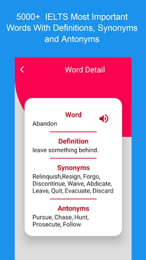 IELTS Vocabulary is off line Application.User can learn IELTS words without any internet connection. IELTS Vocabulary words list is very carefully selected by language experts. Any one who mastered these words, chances of passing IELTS are very high.