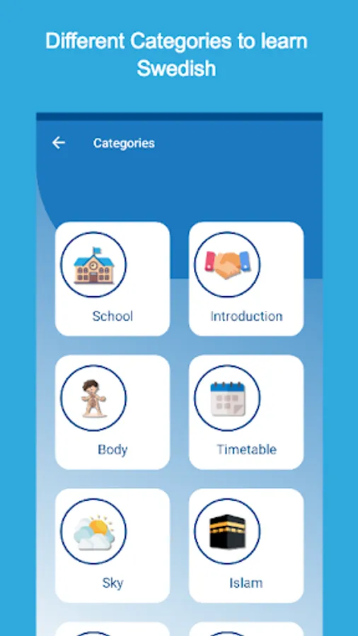 About all general categories are included in Learn Swedish Application like Introduction, school, Islam, Pakistan, weather, calendar, colors, body, animals, food, family, grammer, skills, shopping, numbers, sky, time and conversation etc.