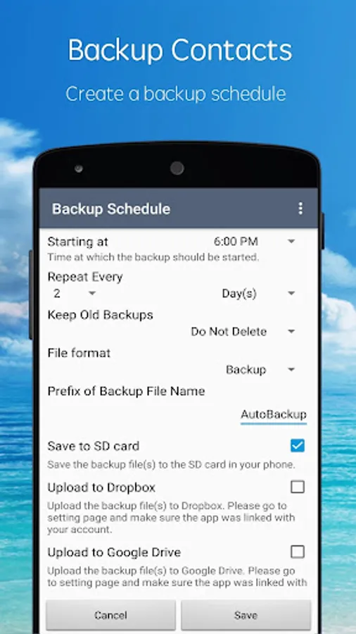 17. Schedule backup. The app can backup all contacts to SD card, Dropbox, Google Drive and Box automatically.