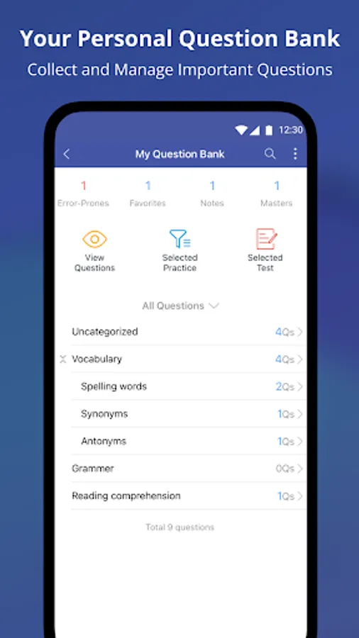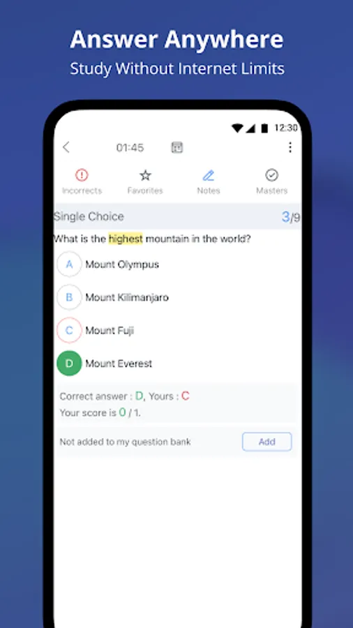 Exams are saved locally on your phone, so you can search exams quickly using keywords. You can also find the exams and questions you recently took.
