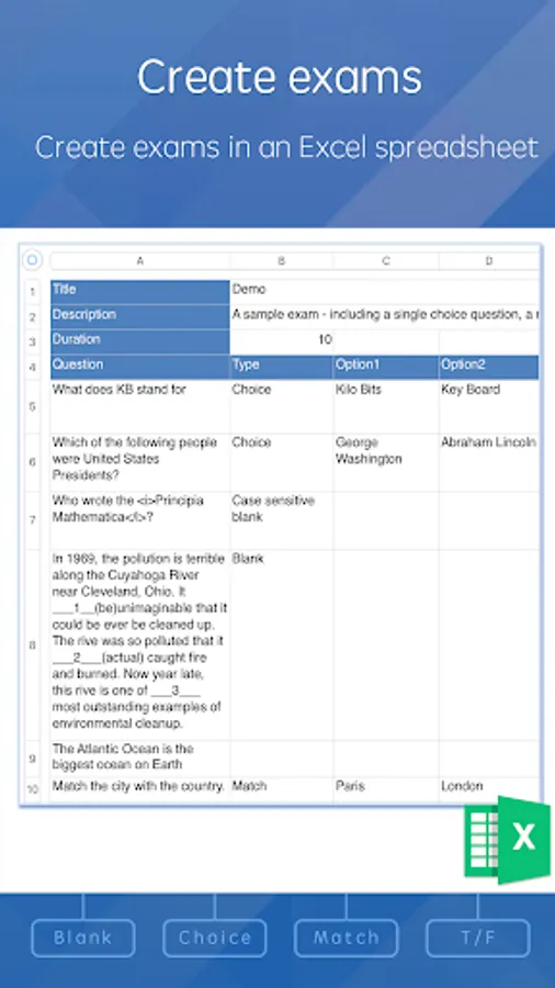 MTestM allows you to use Excel to write multiple-choice, fill-in-the-blank and matching questions in a simple format that can be imported. When creating a large numbers of questions, MTestM can provide a quick way of bulk importing questions.