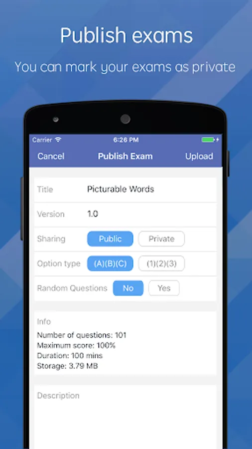 After you have created an exam, you can publish it. You can mark your exams as private if you do not want others to see your exams, otherwise your exam can be seen by others.