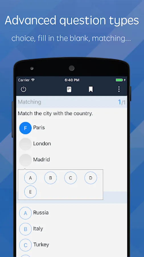 MTestM allows you to create single choice, multiple choice, fill in the blank and matching questions. MTestM supports case sensitive answers and questions having more than one correct answer.