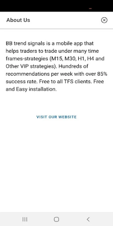 BB trend signals is a mobile app that helps traders to trade under many time frames-strategies (M15, M30, H1, H4 and Other VIP strategies). Hundreds of recommendations per week with over 85% success rate. Free to all TFS clients. Free and Easy installation on IOS and Andriod.