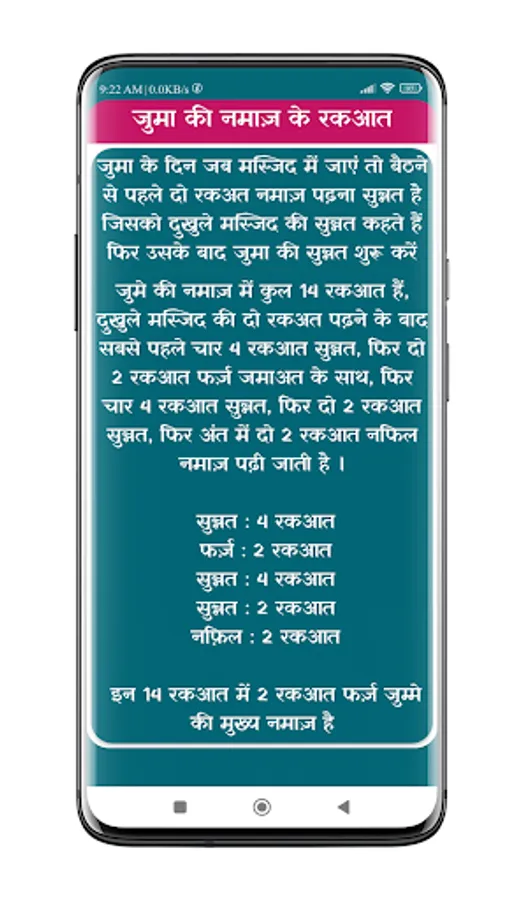 This is an Islamic Hindi Asan Juma Ki Namaz App. If you are looking and want to learn Namaz e Juma Ki Kitab (नमाज़े जुमा की किताब) so it is for you. Through this app you can read and learn Juma Ki Namaz Padhne ka tarika in Hindi (जुमा की नमाज़ पढ़ने का तरीक़ा), Juma Ki Fazilat (जुमा की फ़ज़ीलत) Namaz e Juma Ki Niyat (नमाज़े जुमा की नियत) and Namaz e Juma Ki Rakat (नमाज़े जुमा की रकत). It is totally Hindi Namaze Juma Ka Tarika (नमाज़े जुमा पढ़ने का तरीका) in Hindi Language and offline mode. You don’t need to download anything to read book. It is verified by Misbahi Alim Fazil Jamia Ashrafia.