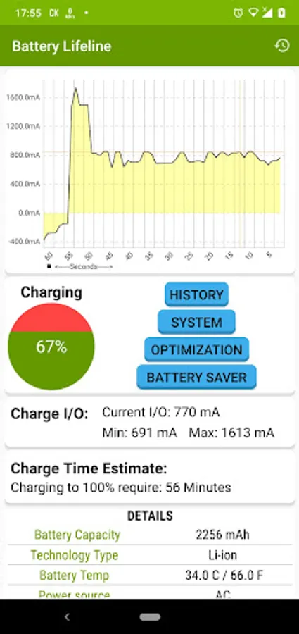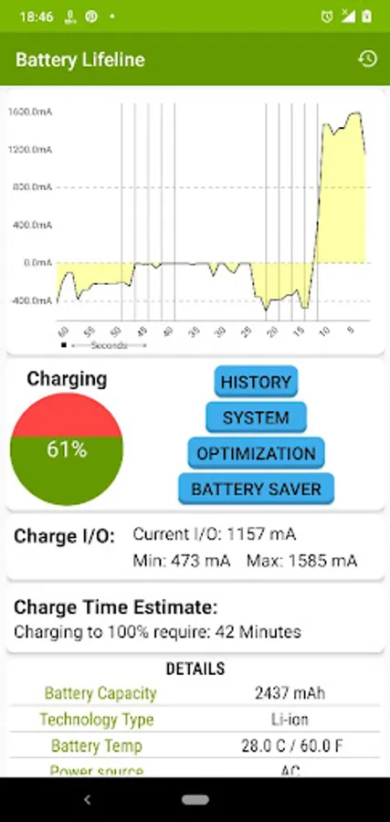 Battery lifeline monitor displays battery usage information, measures electric battery capacity (mAh), show charge time estimates and increase its lifespan.
