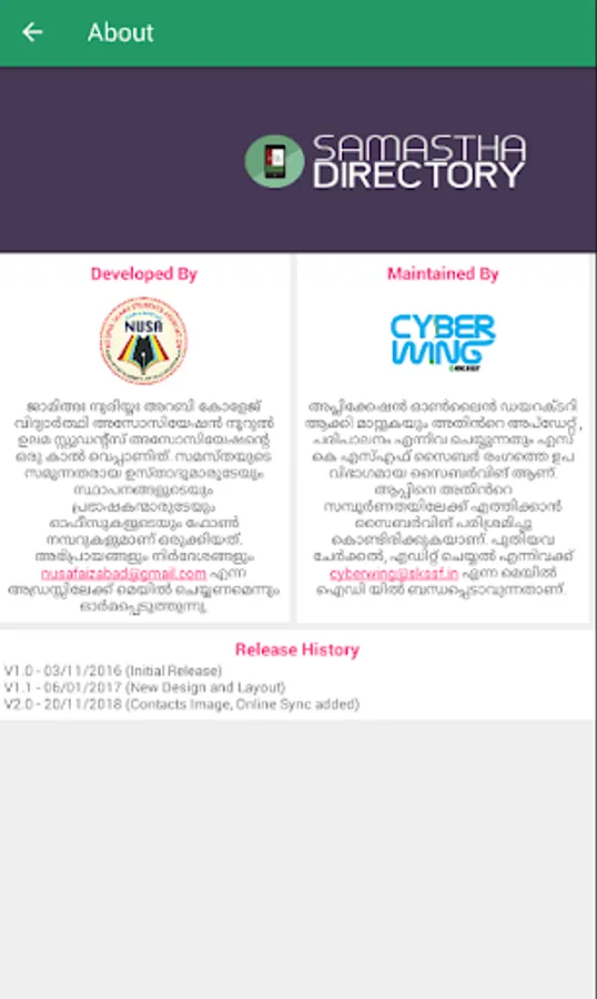 its a e-Directory contains contact number,address and email of Samastha and its sub organisation like SKSSF and Arabic colleges under samatha.