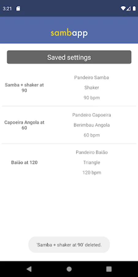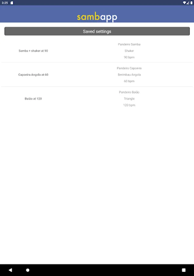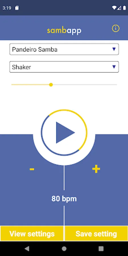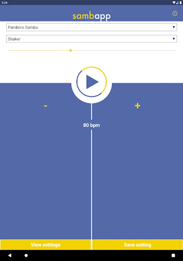 SambApp is a Brazilian rhythm metronome for music/dance/capoeira practice and performance. The app provides a steady beat just like any other metronome, but it adds a more fun and dynamic component with the sound of Brazilian percussion instruments: pandeiro, shaker, triangle, and berimbau.