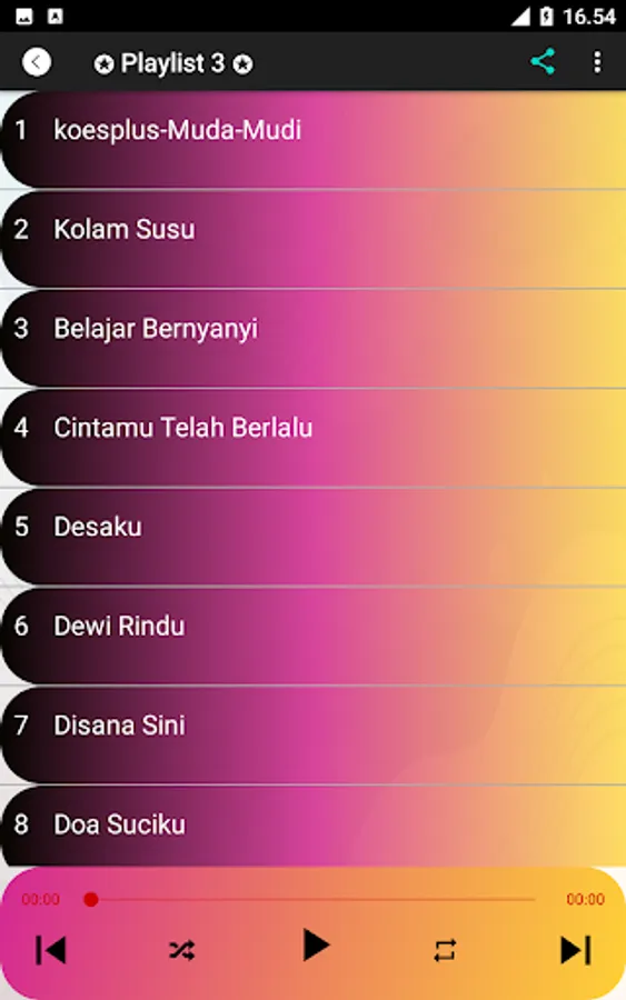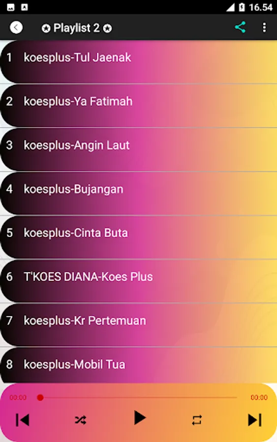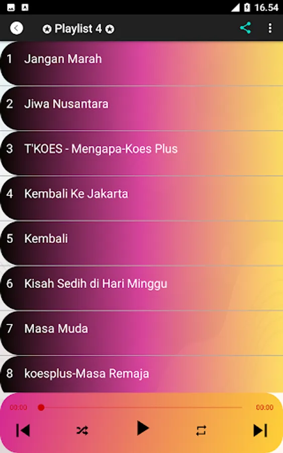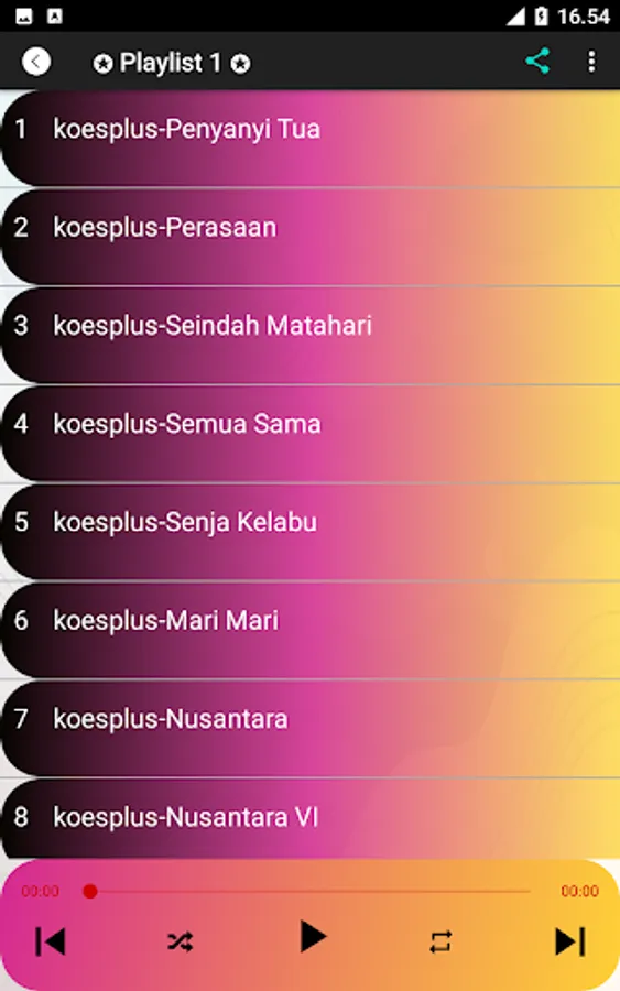 This application is only a music player, while the content associated in it is the full property of the artist or the related record company. This complete collection of Koes Plus songs is very easy to use anytime anywhere without fear of running out of quota,