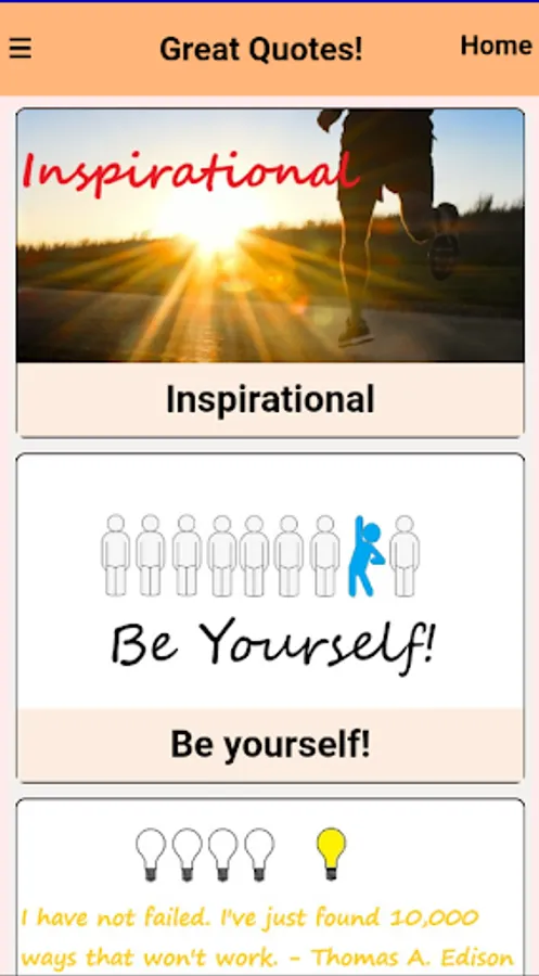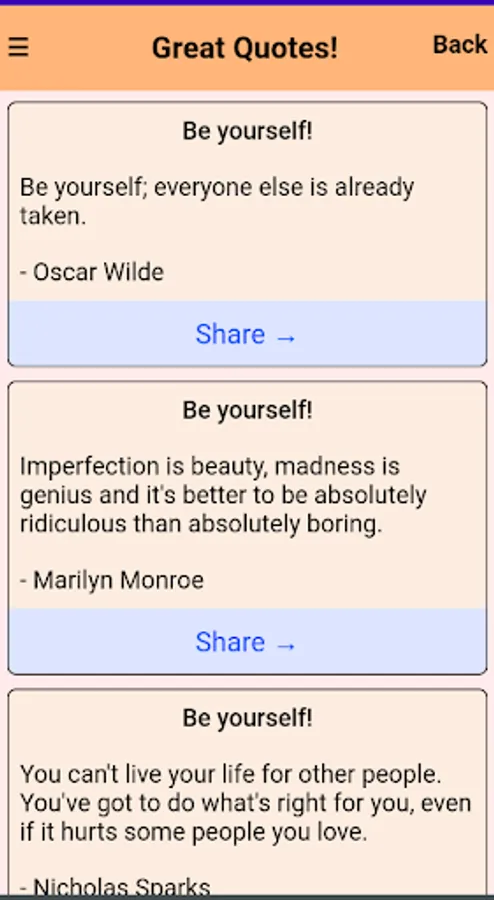 This application provides a sorted collection of Great Meaningful Quotes. These quotes provide inspiration, wisdom, motivation, sarcasm, and much more. Reading these quotes will fill anyone with energy, enthusiasm, motivation, and a bit of humor too. There are some great quotes related to life, art, being yourself, love, peace, etc.