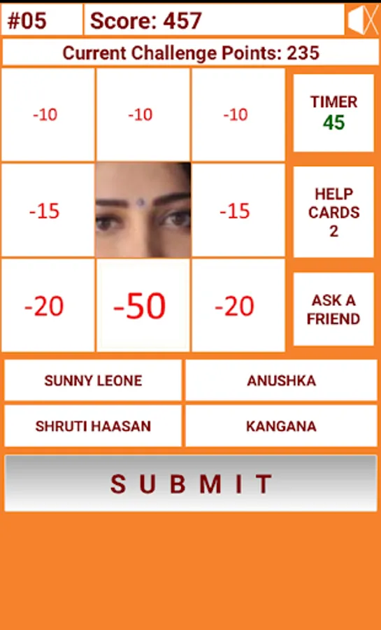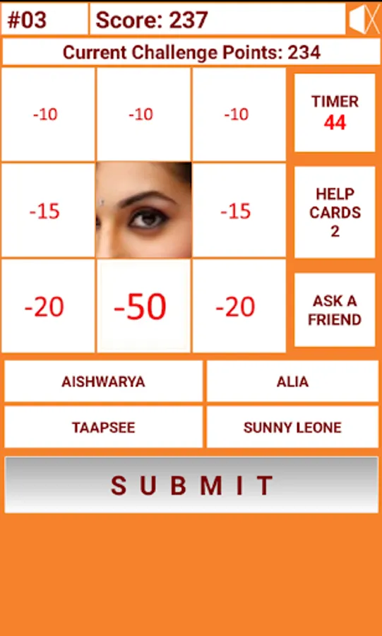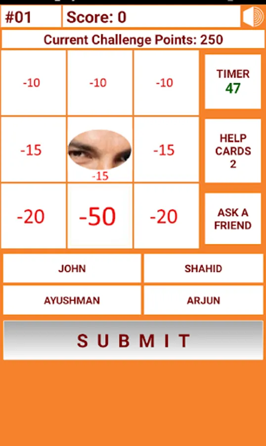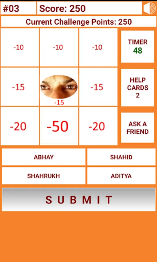 The picture of any Bollywood Star is hidden behind a square of 3*3 tiles. A small portion of the middle tile is kept open at the beginning. If user recognizes the actor or actress looking at the small revealed portion the user gets the full points. Customer can open tiles to reveal more part of the picture which will help to recognize the face of the Bollywood Star at the cost of some points.