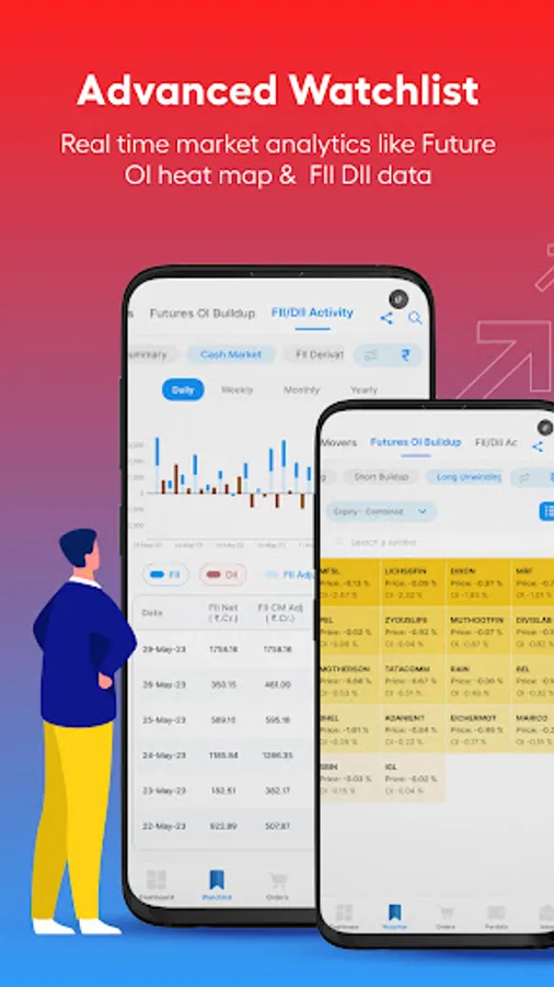 Advanced watchlist: To add stocks, monitor personal index against market movers & unlock the future OI build-up widget for Futures & options trading.