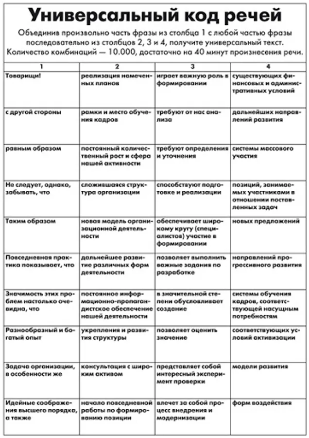 The universal speech code allows you to generate phrases for a speech for 30-40 minutes continuously.
