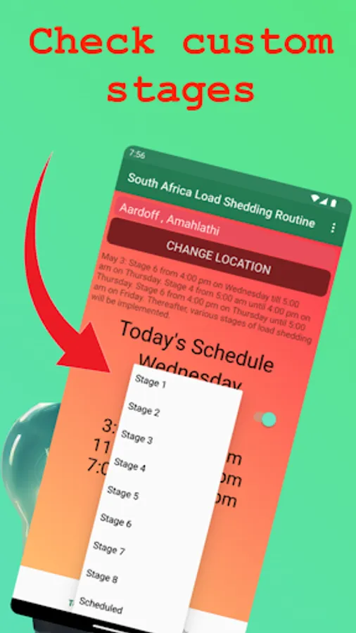 5. Toggle with Stages: Get the routine for scheduled stages or your own customized view. Change the stage easily to see how load shedding would look like if a different stage was implemented.