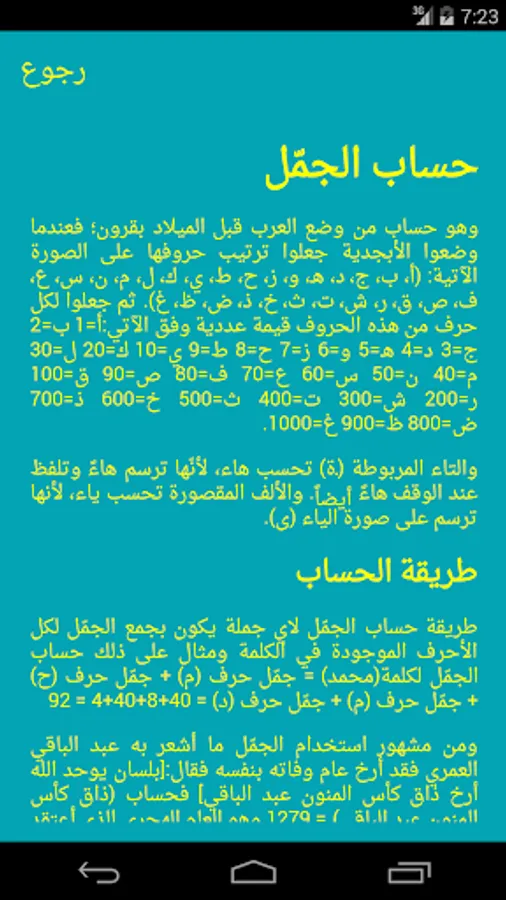 A calculation of the situation of the Arab BC centuries; When they put the alphabet made the order of the alphabet on the following image: (a, b, c, d, e, f, g, h, i, j, k, l, m, n, o, p, q, r, s, t, u, v, w, x, y, z, J, g). Then they made for each character of these letters a numerical value according to the following: a = 1 b = 2 c = 3 d = 4 H = 5 and 6 = g = 7 h = 8 i = 9 J = 10 K = 20 for = 30 m = 40 n = 50 x = 60 n = 70 P = 80, p = 90 s t = 100 = 200 = 300 u v w = 400 = 500 x 600 = y = z = 700 800 J = 900 n = 1000.