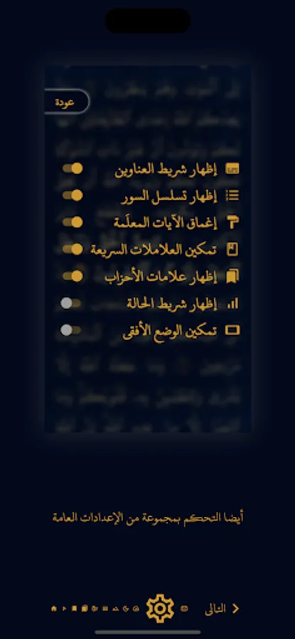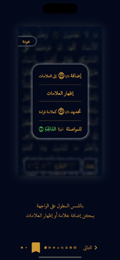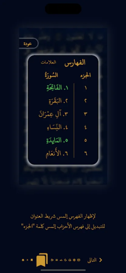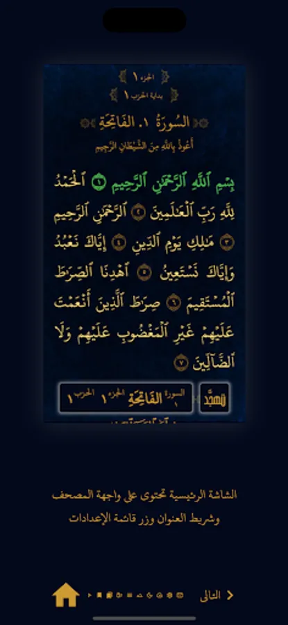 The application contains many advantages such as indexing the surahs, parts and parties, the ease of adding reading signs and simplicity of coordination with distinct and clear coloring of the verses, which facilitates the night reading that is comfortable for the eye.