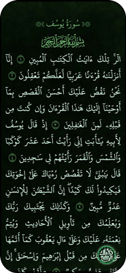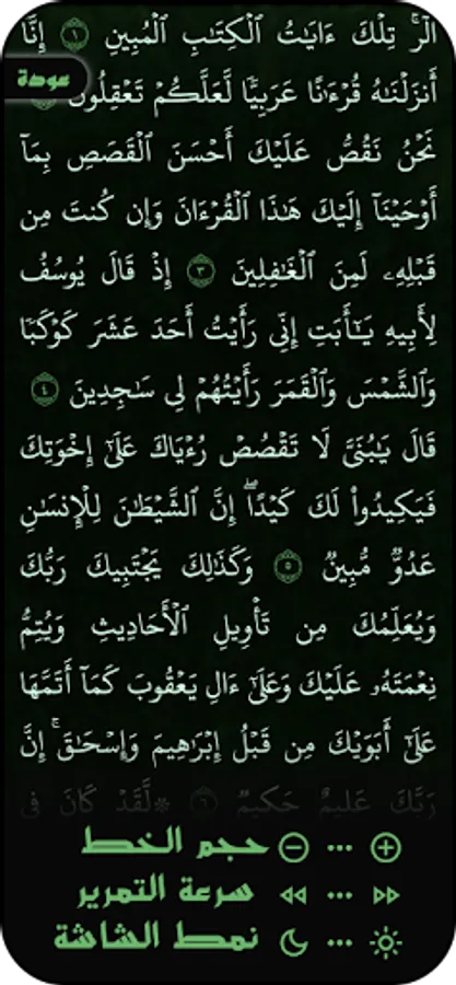 This application to facilitate reading and contemplation of Surat Yusuf and includes many advantages such as automatic scrolling for a simplified and easy reading as well as controlling the font size, scrolling speed and screen colors in proportion to the different operating requirements.