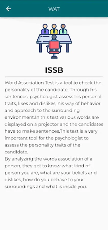 Designed to enhance your cognitive abilities and sharpen your verbal acuity, our app provides a comprehensive platform for practicing and mastering the crucial WAT component. Immerse yourself in a series of challenging word association exercises, precisely tailored to the ISSB testing standards. Develop your critical thinking, expand your vocabulary, and hone your ability to make quick and logical associations. Download now and immerse yourself in the captivating world of words!"