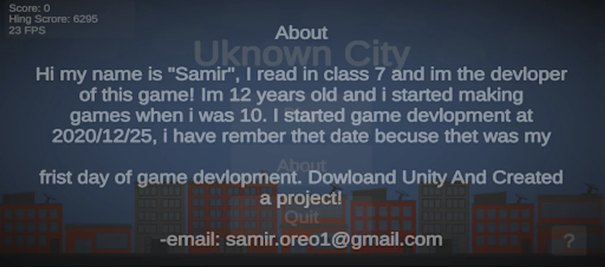 My name is Samir✨✨, and I'm the developer of the game💻💻! I'm 12 years old😃, This game is about to save a city form missiles😉😉. You have to destroy the missiles before they hit the city or the buildings 🔨🔨🔥. You have to save the city by clicking the missiles🤔🤔, By clicking them they will destroy😅😓.