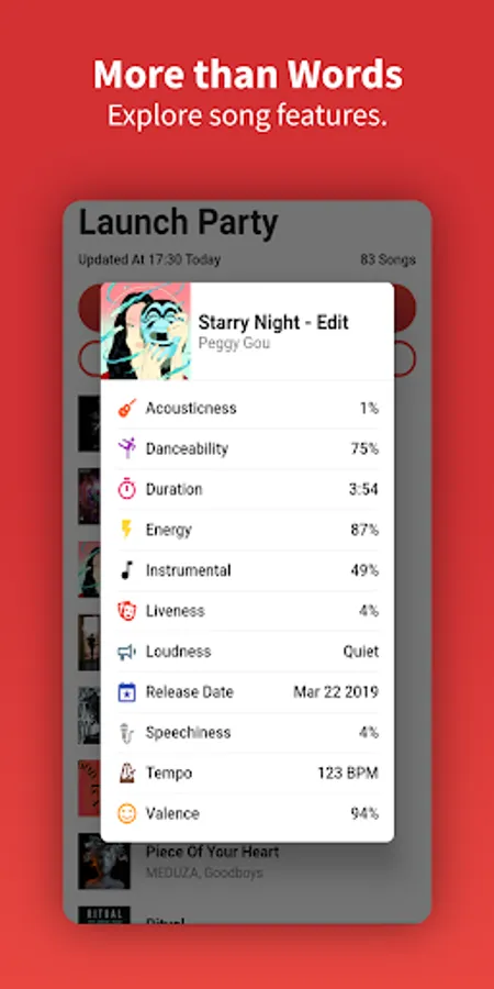 Using machine learning and advanced signal processing, songs are analysed and quantified by their musical features.