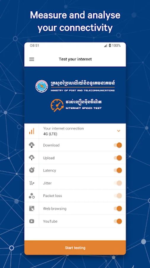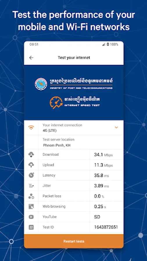 The main purpose of this App is to provide visibility, accuracy, and transparency of broadband performance data which then contributes to improve quality of telecommunications services in the Kingdom of Cambodia.