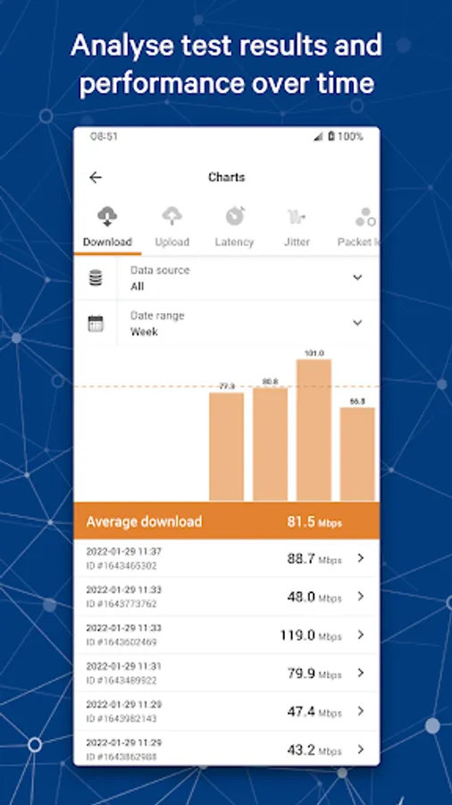 The App allows user to measure the performance of their broadband performance, Wi-Fi and cellular connections, by running the tests with one click and the test result will provide information such as download and upload speed, latency, jitter, packet loss, web browsing, and Youtube streaming.