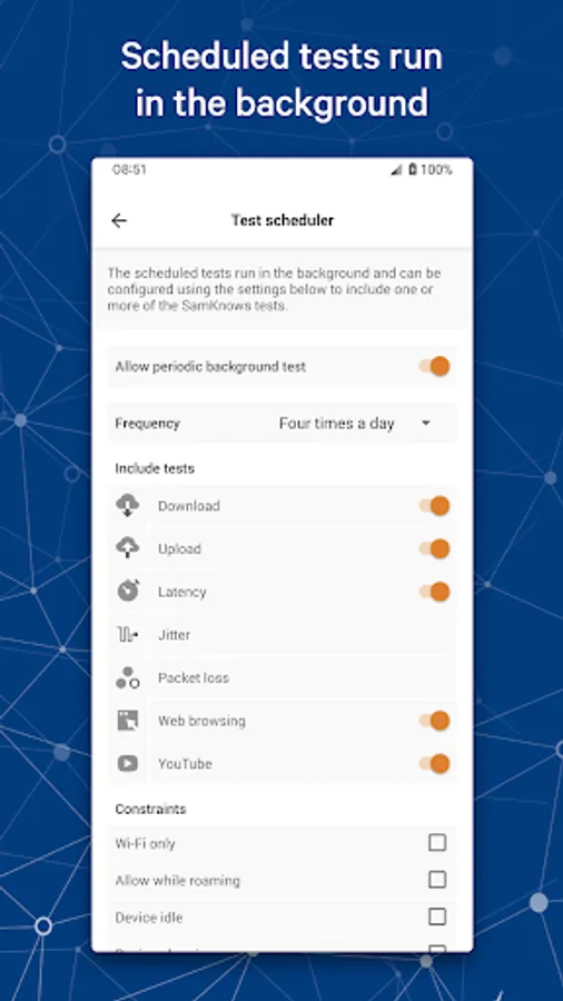 -Run manual tests by selecting the following metrics - download and upload speed, latency, jitter, packet loss, web browsing, and Youtube streaming