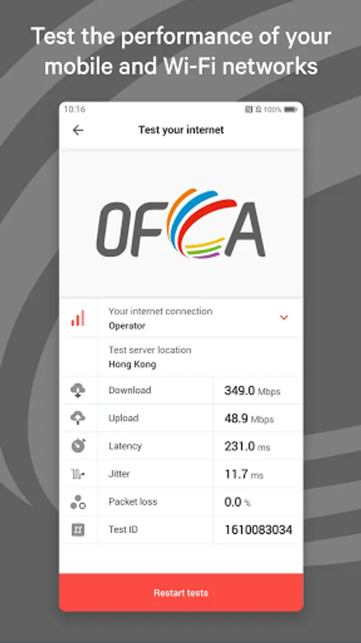 This mobile app is designed, developed and maintained by SamKnows Limited as commissioned by the Office of the Communications Authority for provision of broadband performance test service in Hong Kong. The data usage for the use of this mobile app varies with the speed of mobile broadband connection under test. Please refer to “About” tab inside the app for the evaluation of data usage. Users are advised to keep track of their data usage from time to time in order to avoid any unnecessary mobile bill charges.