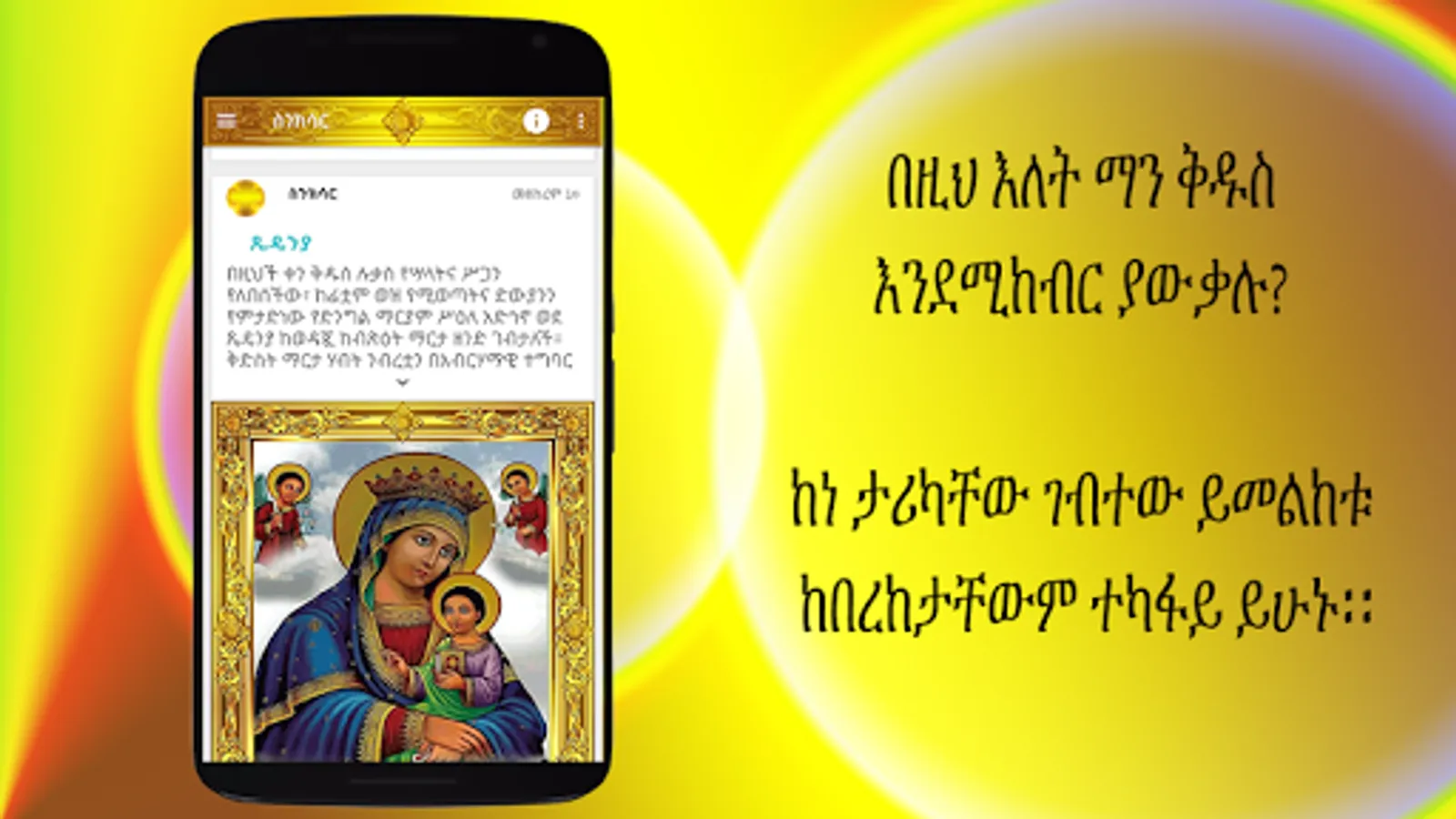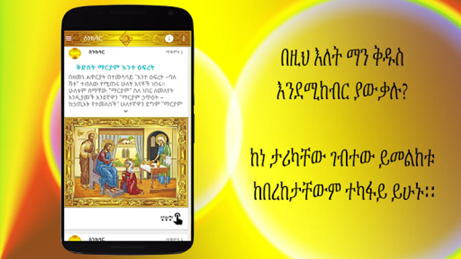 In order to learn from the Synaxarium or history and Lives of the Christian Saints and to get better in your Christianity especially in Orthodox Tewahedo Church life we highly recommend you to read the book, and for those of you who couldn’t access the book here is an App for it which contain the main stories with pictures illustrating the story.