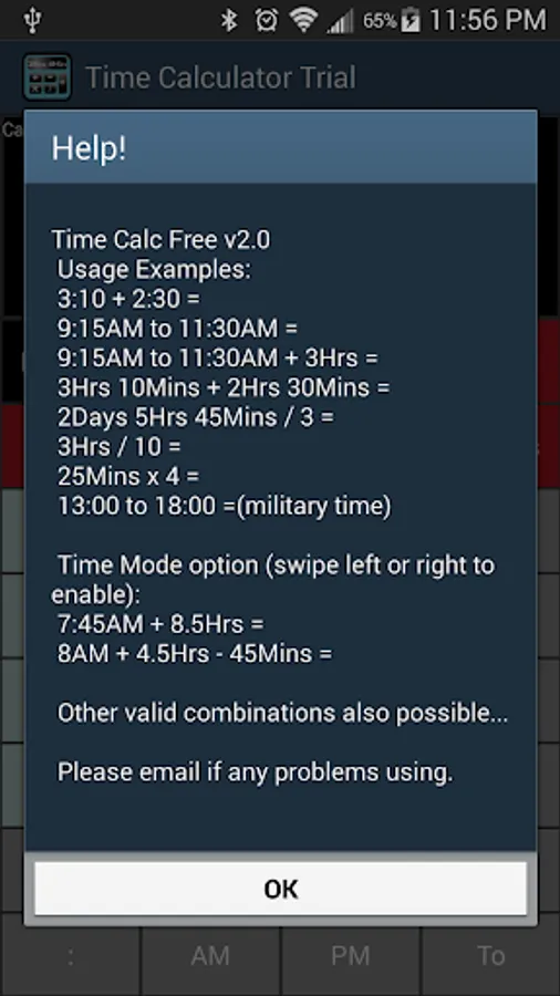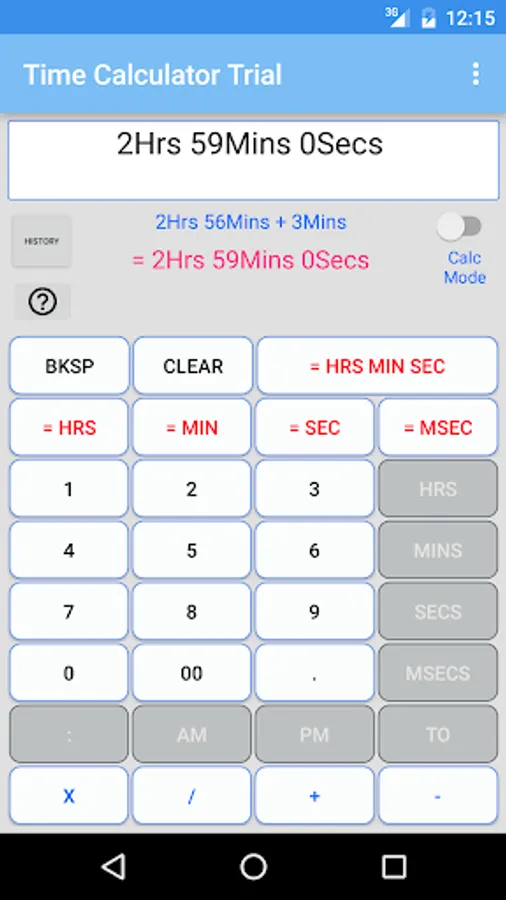 Consider Time Calculator PRO version for only 99¢ which has more features, Multiply, Divide, PM and To buttons, military time.