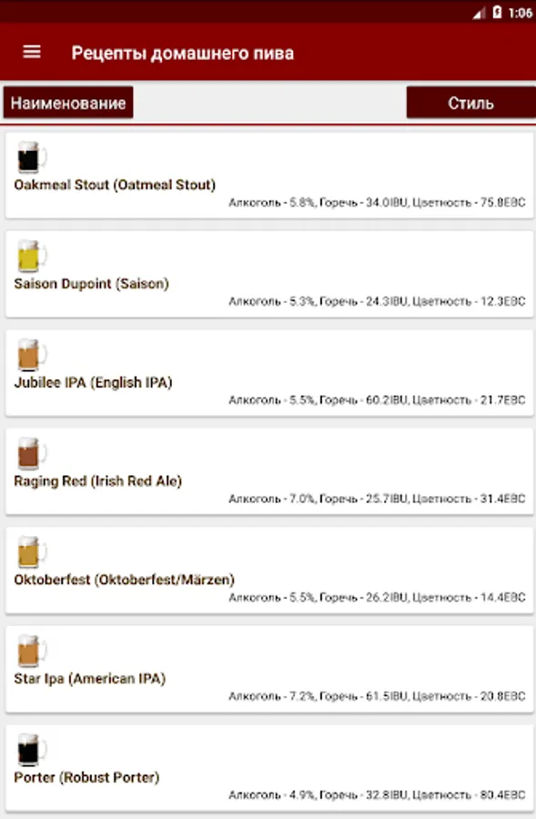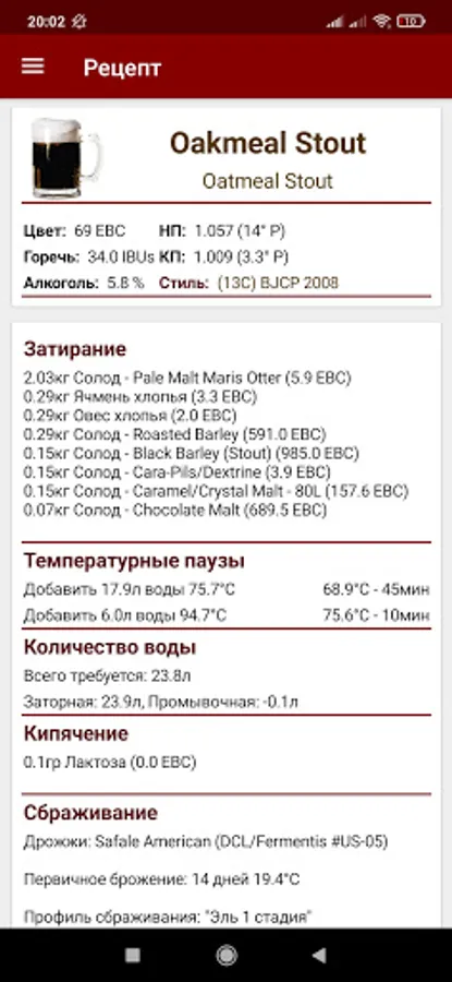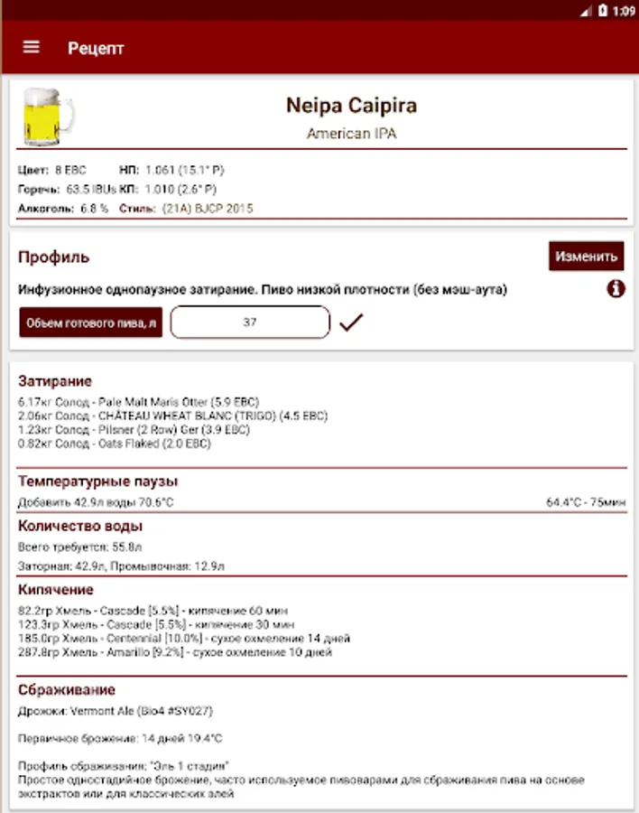 The application will calculate the amount of malt, hops, additives, as well as the amount of mash and wash water, its temperature and necessary thermal breaks in accordance with the selected mash profile.