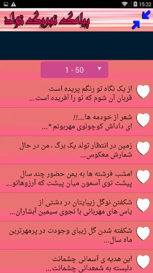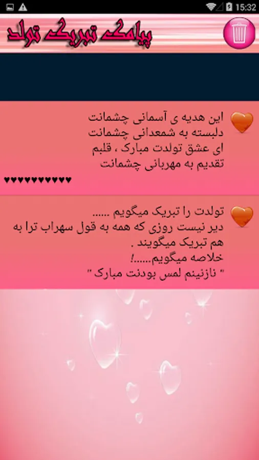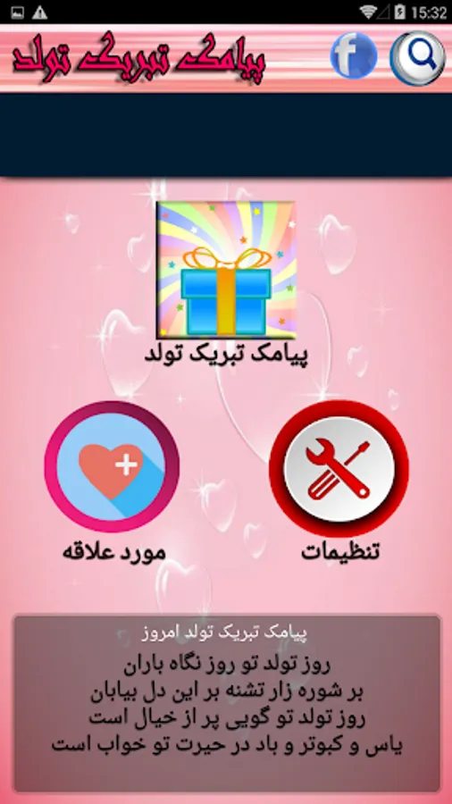 This includes software for beautiful SMS, romantic birthday greeting SMS, Persian happy birthday SMS, beautiful romantic phrases. Compatibility with all apps.