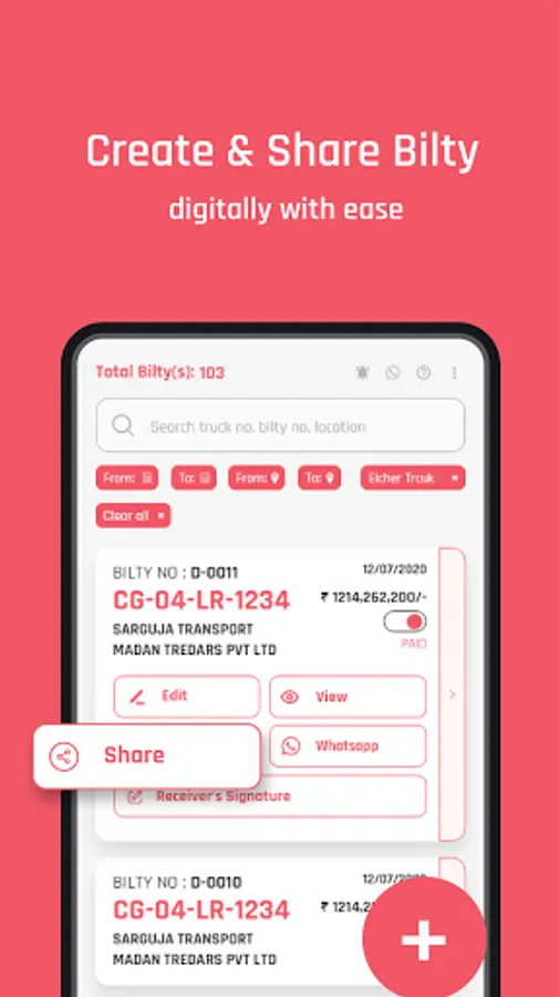 Customers Simply create their professional and elegant looking transport Bilty, LR within a minute and share with anyone right from their phone or desktop.