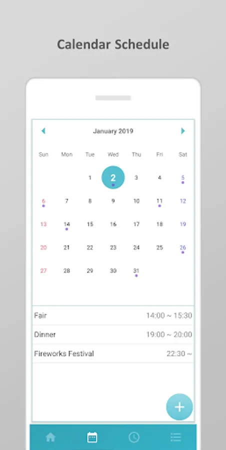 - Add a schedule at a calendar by selecting the date and touch + button at the right-bottom side.
