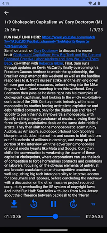 + Downloading for off line listening of the most recent 25 daily podcasts (wifi suggested to avoid data charges)