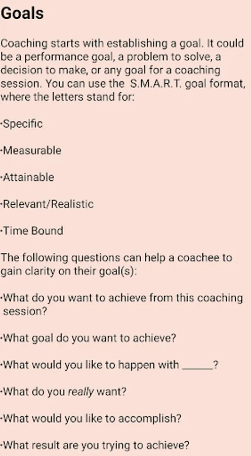 Use sample questions to find out the Goals, Reality, Options & Will of the coachee.