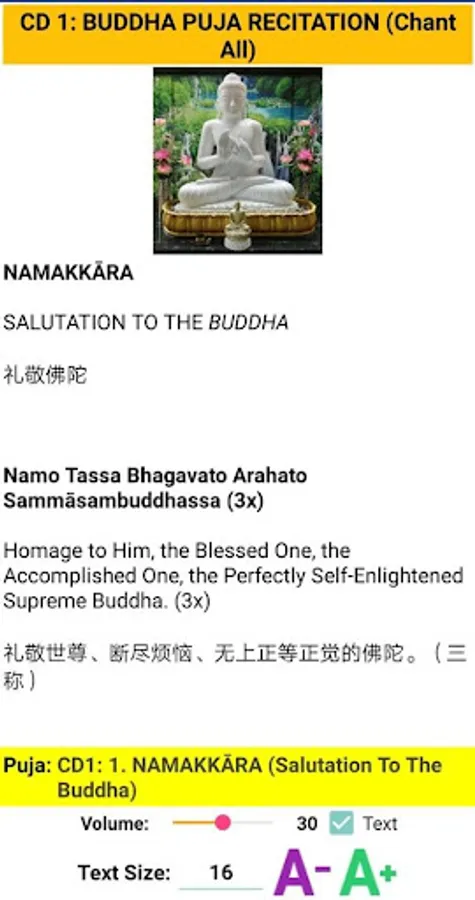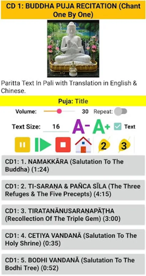 Buddhist Puja, Sutta & Paritta Chants in Pali by Buddhist Monk Bhante Indarathana with translations in English and Chinese. The chanting are accompanied by soothing background music arranged by Imee Ooi.