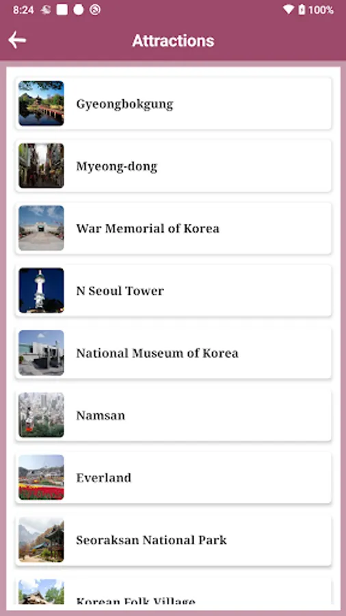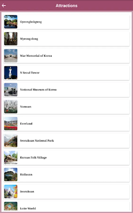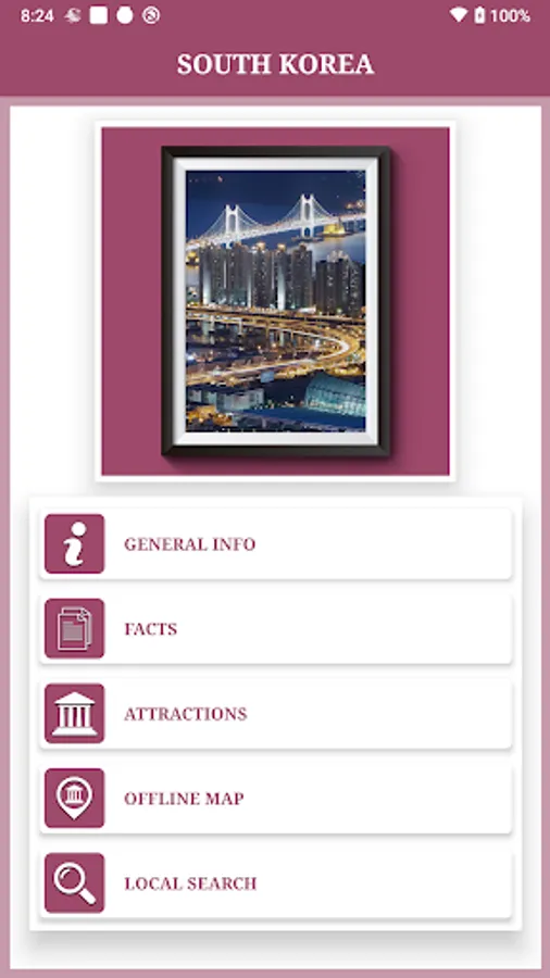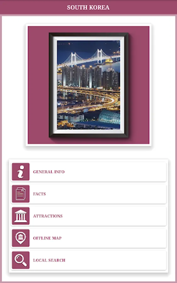This is a premier Android app catering to almost every Travel information of South Korea. It features 5 different modules providing information of the South Korea like General Info, Facts, Attractions, Offline Map, Local Search(Nearest Search).
