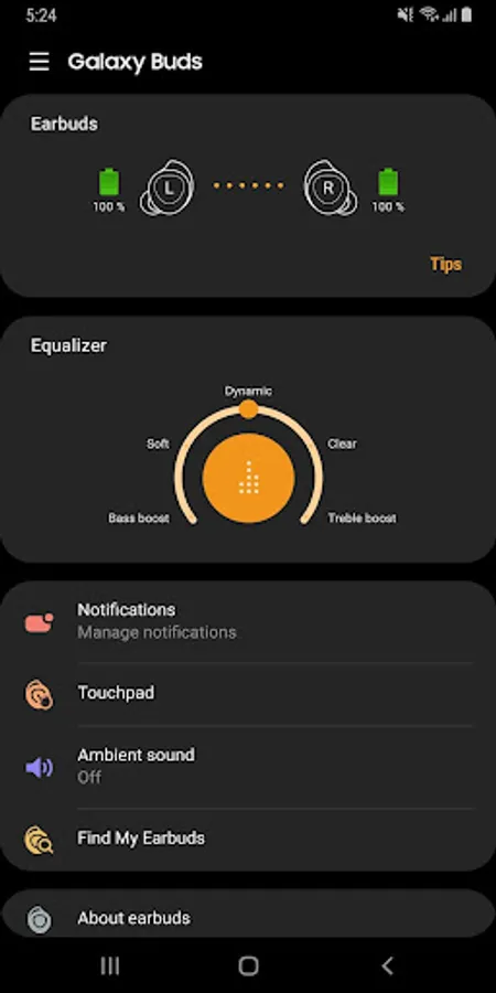 The Galaxy Buds Manager allows you to use features such as device settings and status view when connected to a Galaxy Buds device.