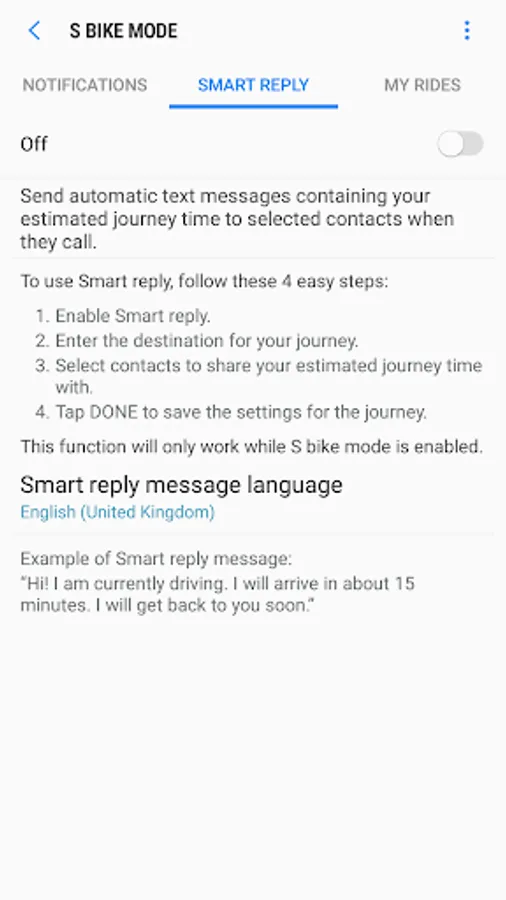 Ever experienced multiple incoming calls, while driving, from particular contacts who just want to know your time of arrival? Now, keep selected contacts notified of your time to arrival with the Smart reply feature. Customize the feature for a journey, enable it, enter your destination and select contacts to share your estimated journey time with. When any of the selected contacts try to call you, they will receive automatic text message with the time it will take you to reach your destination. Standard text message and mobile data charges will apply.
