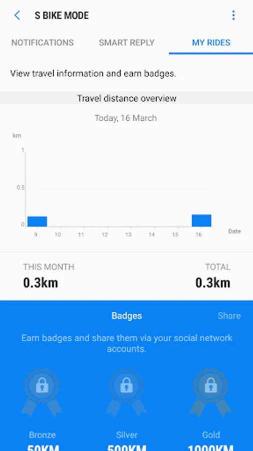 View your S Bike mode usage details and earn badges for continued use of S Bike mode while driving.