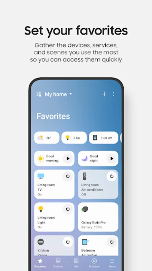 - Build routines that are set on time, weather, and device status, so your home runs smoothly in the background