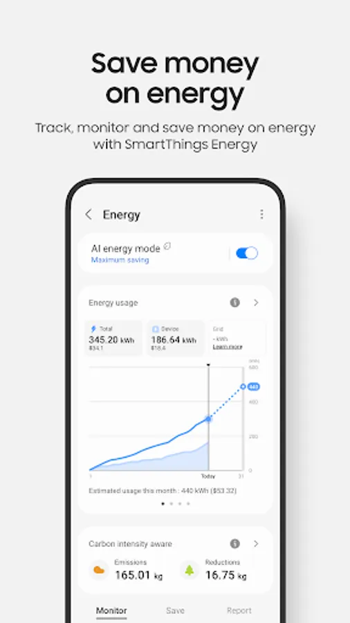 - Track, monitor and save money on energy with SmartThings Energy. See how much your home and compatible Samsung devices cost to run, and try various energy saving features, such as AI saving mode, or schedule devices to run during off peak hours.