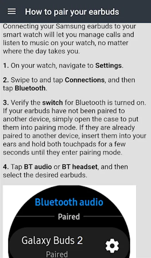 You can get information about galaxy buds2 in the app content. Like use, wear and active noise canceling, and how to clean your device. In addition, there are topics such as how to pair Samsung galaxy buds 2 app, how to use touch controls and how to upgrade firmware.This app is a guide that should be at hand for anyone with Galaxy Buds 2. It does not belong to an official brand.