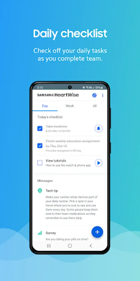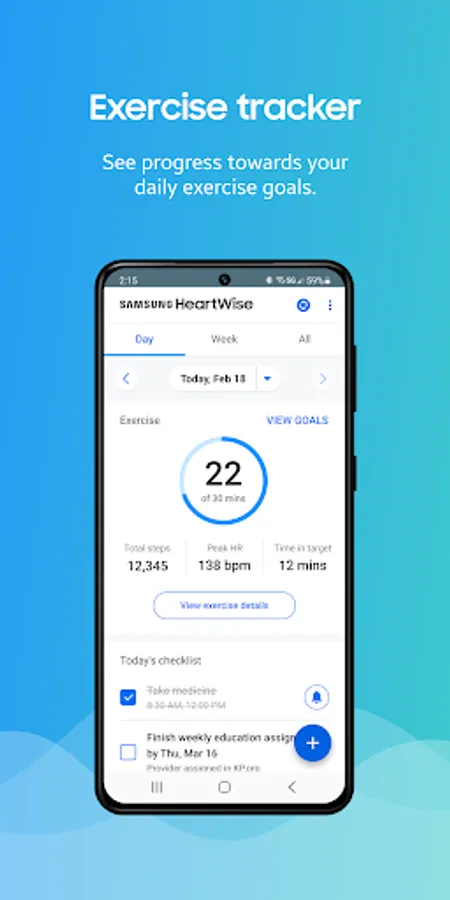 Samsung HeartWise is an app for patients participating in the HeartWise home-based heart-wellness program. The app uses your phone and a Samsung smartwatch to promote a healthy lifestyle.