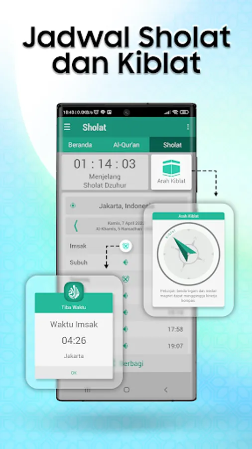 Accurate prayer times (Subuh, Dzuhur, Ashar, Magrib, & Isya) based on location.